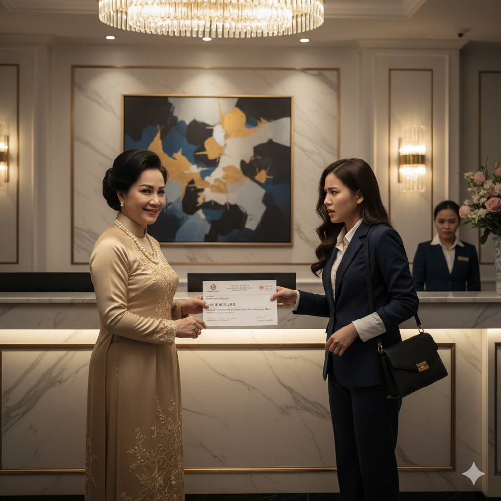 Tôi đứng sững, xung quanh vài nhân viên lễ tân đang liếc nhìn, còn bà thì ra vẻ thách thức. Tôi cảm nhận rõ ràng, bà cố tình ép tôi trả tiền để khoe khoang với thiên hạ rằng con dâu bà “giàu có, hào phóng”.